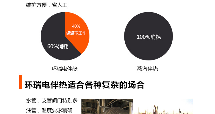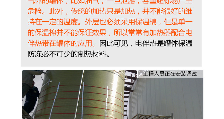 所以,罐體不僅要防凍保溫,仍需要加熱。據此,可選擇不同的電伴熱種類,予以實現,它不用接觸罐體的介質,只靠熱量的傳遞,達到保溫加熱的效果。