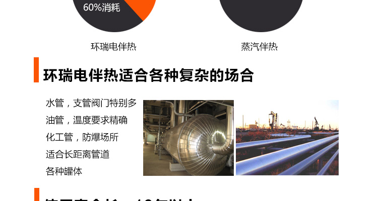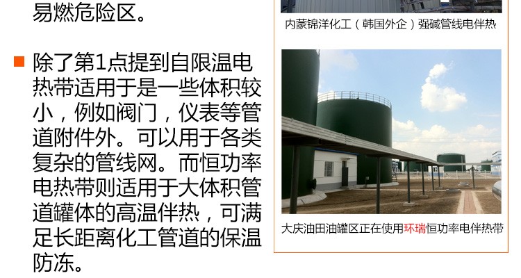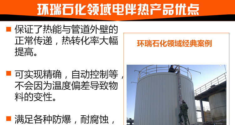 石化場所下的長距離管道,因輸送過程和長時間的儲存過程中會因散熱造成溫度下降,溫度的下降會使粘性物料的粘度升高,而對易結晶物料則可能使物料產生結晶,從而造成料液的輸送發生困難,嚴重的會造成管道系統的堵塞。為避免這種情況發生,必須對系統散失的熱量予以及時補充,即對系統進行連續不斷地加熱。 |